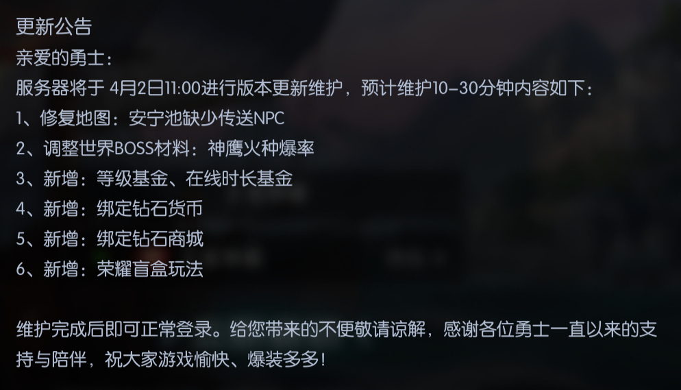 1. 本次更新维护将于4月2日11:00准时开启,维护期间所有服务器将暂时关闭,无法登录游戏,请各位勇士提前退出游戏,妥善保存游戏数据,避免数据丢失。